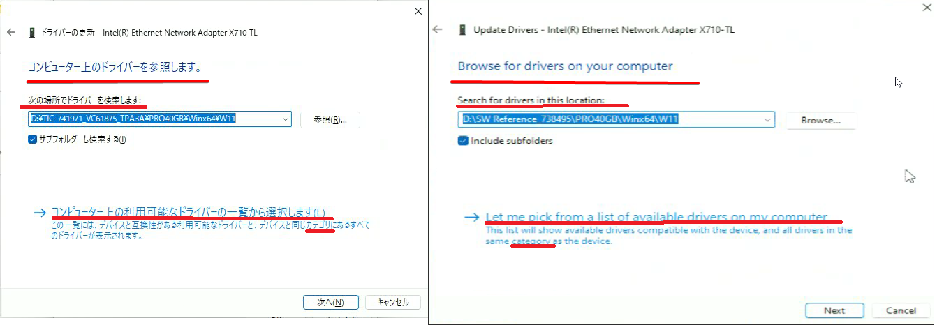 Issue summary: New Driver - Update Driver - translations out of context for [Browse for drivers on your computer] pane. Using です・ます form is not common style in this context. Also one sentence added unnecessary punctuation ("。") not matching the source, and the transliteration of "category" violates Intel JP Style Guide.